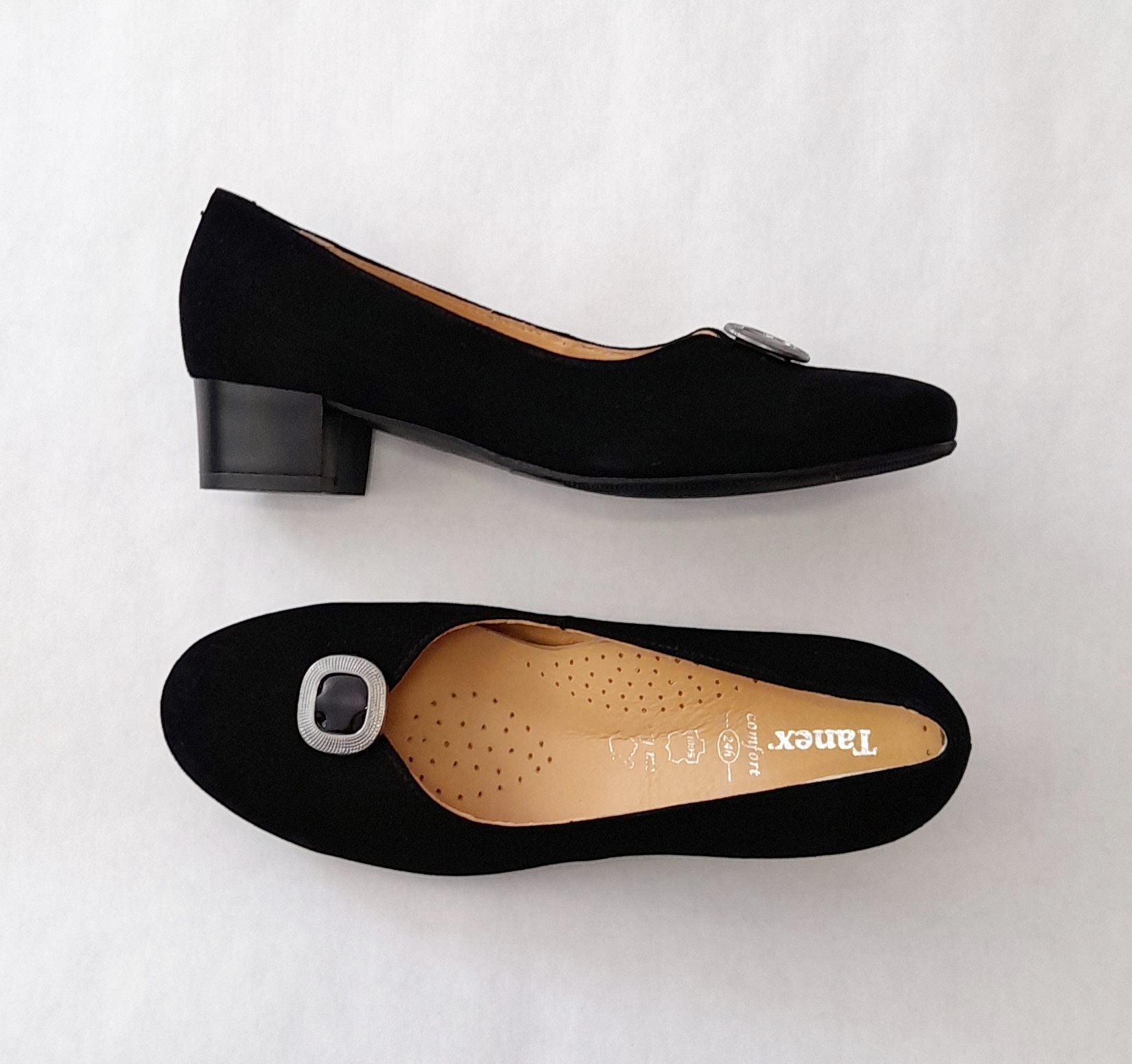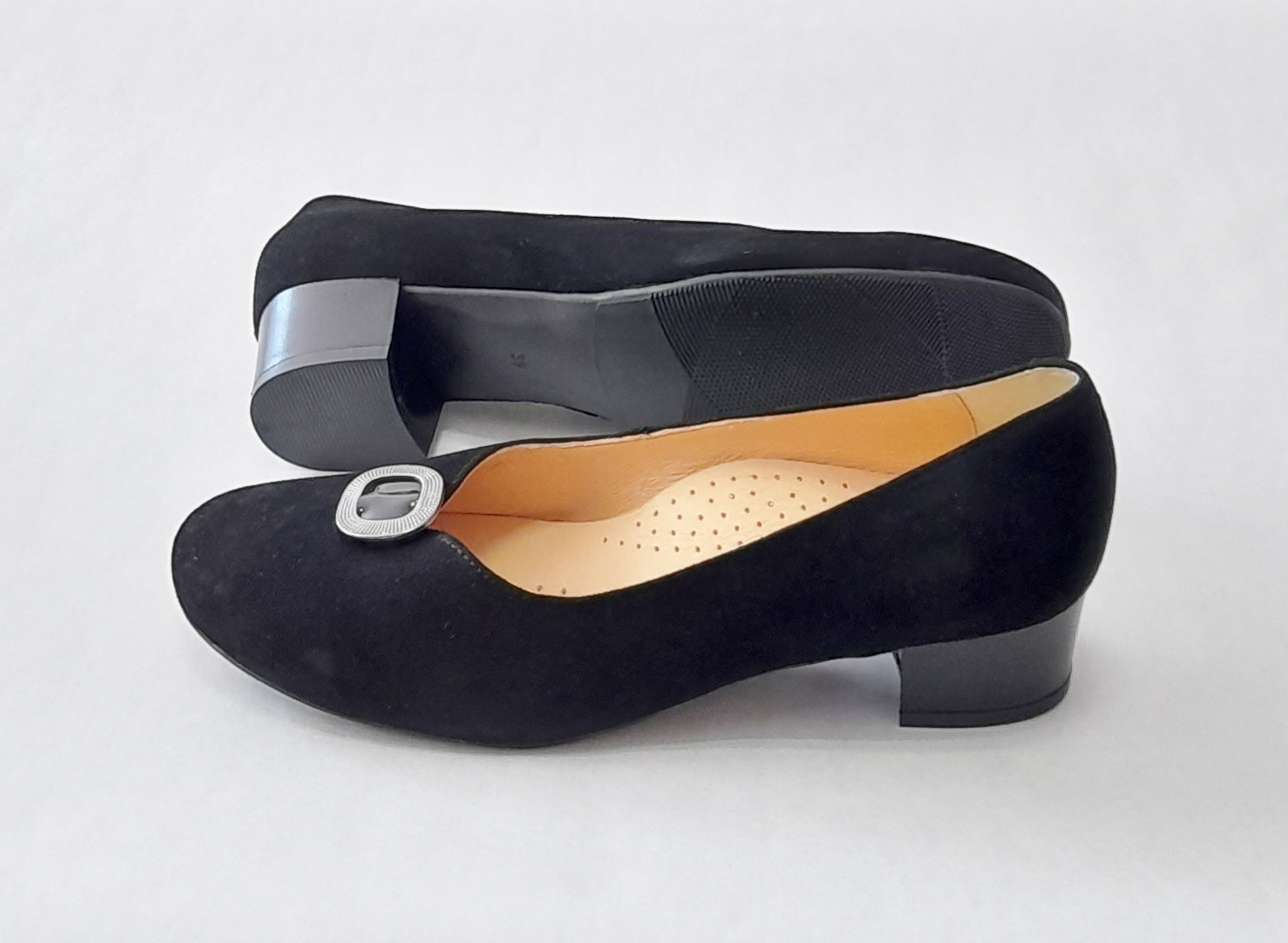Zvršok zhotovený z pravej brúsenej kože, ktorá sa rýchlo prispôsobí chodidlu. Stielka príjemná a mäkká s vyvýšenou klenbou, ktorá zaručuje maximálny komfort. Lodičky šírky H+ vhodné na široké chodidlá, hallux a kladivkové prsty. Výška podpätku je 3,7cm.