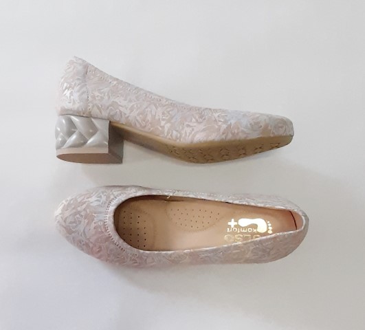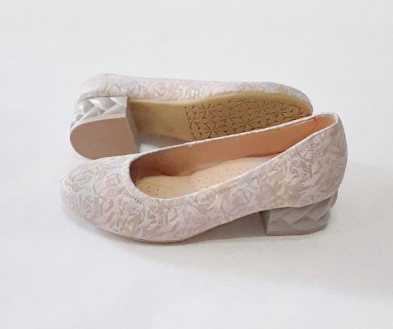 Zvršok zhotovený z pravej kože s farebnou potlačou. Vnútro je podšité hladkou kožou. Stielka kožená, veľmi mäkká a príjemná s tvarovaním vyvýšenej klenby a mäkkého vankúšika na zmiernenie otrasov pri došľape. Výška podpätku 4cm.