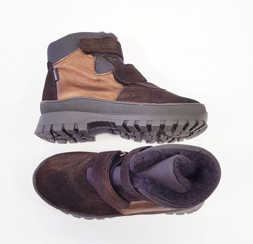 Zvršok topánky zhotovený z pravej kože z kozy v kombinácii s odolným textilom. Vnútro topánok dobre zateplené ovčím rúnom. Obuv je maximálne pohodlná a mäkká s miernou klenbou. Pevná päta. Špička s vyvýšeným okopom.